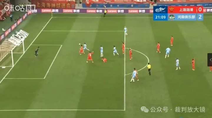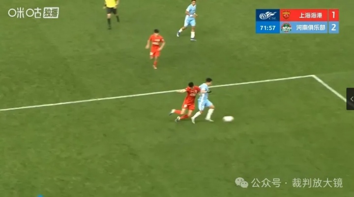 分析刘祝润的进球我们先看一下魏震防守时疑似从身后撞到何超,VAR核查后没介入,海港发出球门球后,形成了刘祝润的这个进球,一来一回,两个关键判罚。