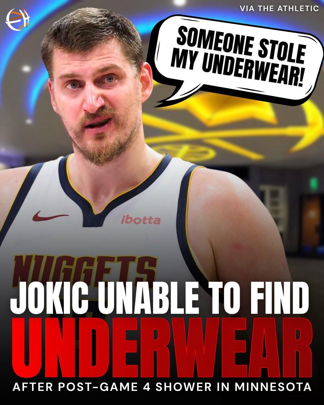 据TA记者Jason Quick报道,约基奇在比赛结束后立马去冲澡,但冲完澡后发现自己的内裤不见了,这令约基奇感到愤怒,约基奇在更衣室喊道:“有人偷了我的内裤!(someone stole my underwear)”