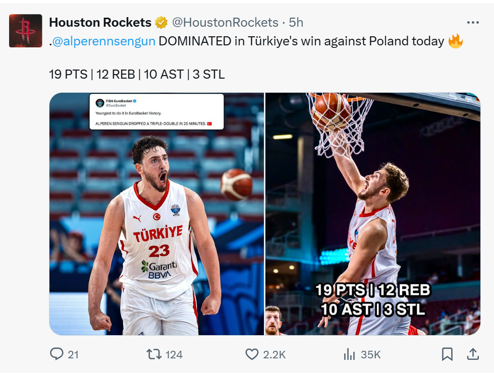本届欧洲杯,申京在土耳其国家队打出了现象级表现,带领土耳其7战全胜打进四强。申京场均可以得到21.6分10.9篮板7.1次助攻1抢断0.9盖帽,完全是MVP级别表现。休赛期火箭队得到了杜兰特、史密斯等多名强援,加上持续进化的申京,火箭的新赛季值得期待。